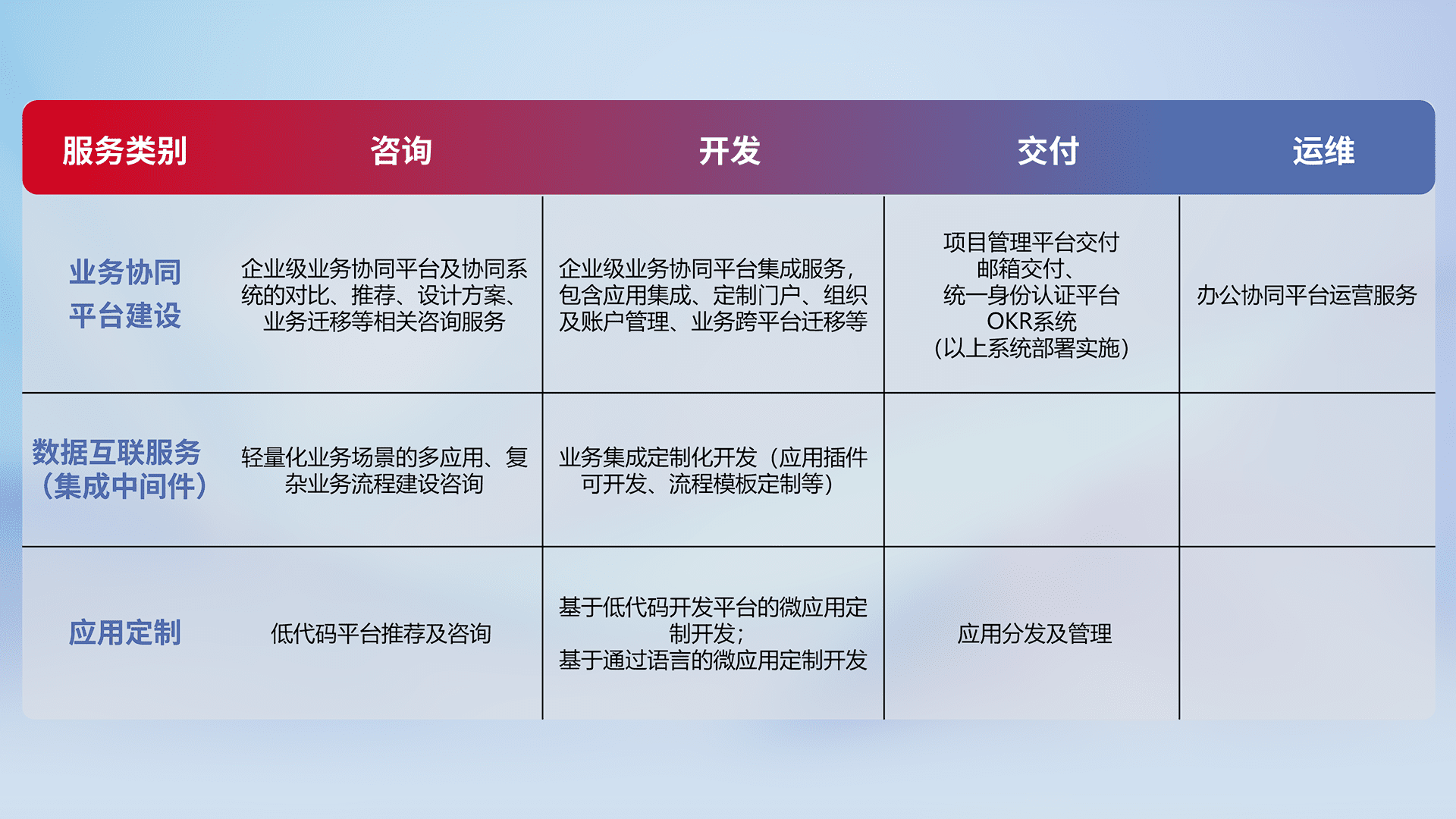 针对钉钉、、、、企微、、、、IDaas等平台级产品提供产品的规划、、、方案、、、交付、、定制化开发等服务,,实现如统一协同办公、、、智能客户服务、、混合会议管理、、、智能数据查询、、、等业务场景,,,实现数字化转型。。。。